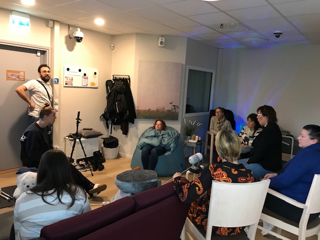 Matkailun opiskelijat ja opettaja Marjut MeWet-kodissa ideoimassa elämystoimintaa ja tapahtumia.