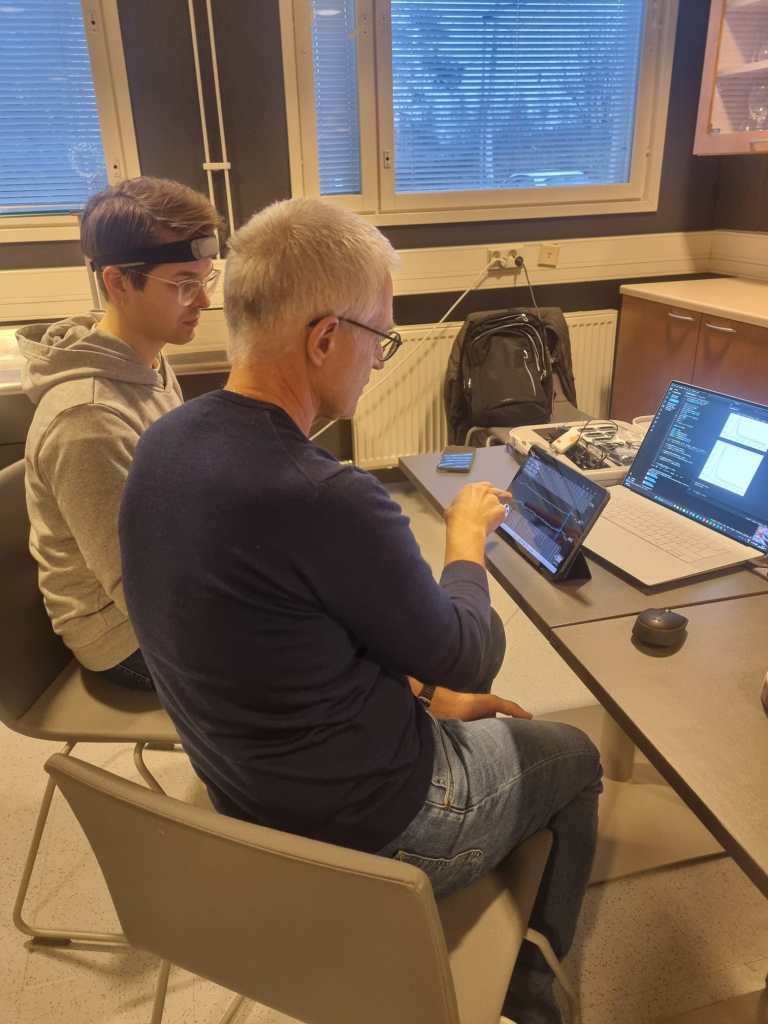 Kuvassa Rakastajat-teatterista Henri Välikangas ja EHEÄ-hankkeen Tarmo Lipping mittamassa aivosähkökäyrää – miten kulttuurihyvinvointia voidaan mitata objektiivisesti?