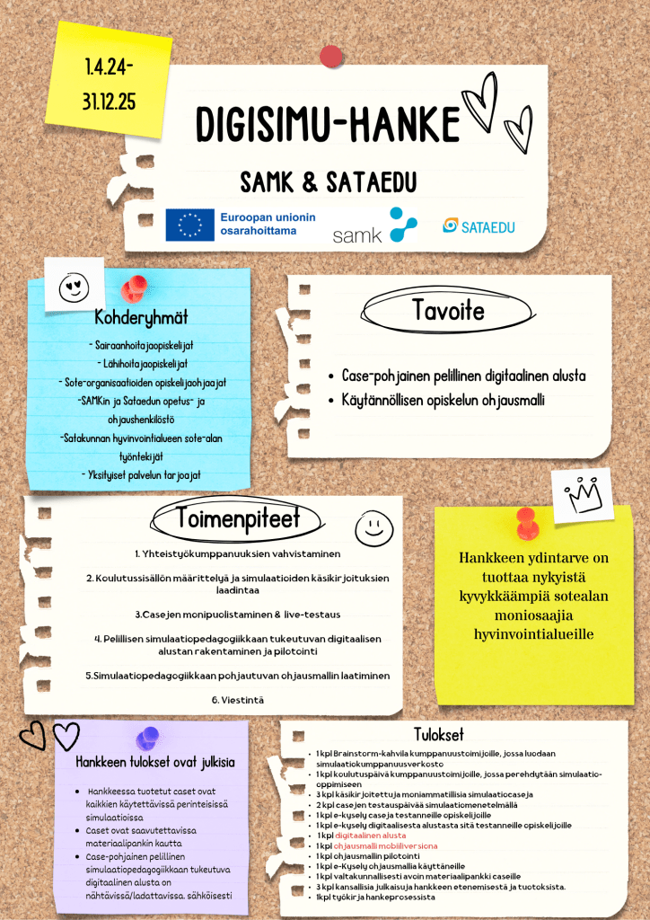 Sataedu ja SAMK kouluttavat hoitotyön ammattilaisia. Sataedu kouluttaa lähihoitajia ja SAMK sairaanhoitajia. Nämä ammattiryhmät työskentelevät rinnakkain hoitotyössä. Sataedun ja SAMK:n moniammatillinen opettajatiimiyhdisti opetuksen 21.5.2024 verkkosimulaation keinoin. Verkkosimulaatioon osallistui yli 200 opiskelijaa. SAMK:n opiskelijat osallistuivat SAMK:n pääkampukselta. Sataedun filippiiniläistaustaiset opiskelijat osallistuivat Teamsillä.