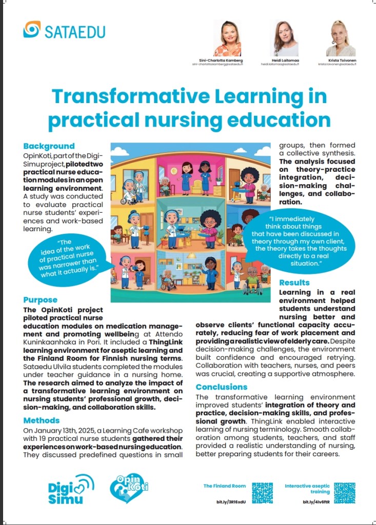Konferenssin posteri Tranformative Learning in practical nursing education. Konferenssin kaikki abstraktit voi lukea, abstraktikirjasta täältä